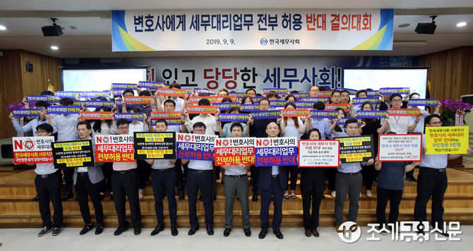 한국세무사회 사무처 직원 100여명(서울, 중부, 인천지방회 사무국 포함)은 10일 오전 10시 서초동 한국세무사회관 대강당에서 ‘변호사 세무대리 업무 전부허용'하는 세무사법 개정에 반대하며, "세무사법 개정 반대 국민청원에 사무처 직원들이 적극 나서 5만명 이상의 동의를 책임지겠다"는 적극적인 실천을 다짐했다.