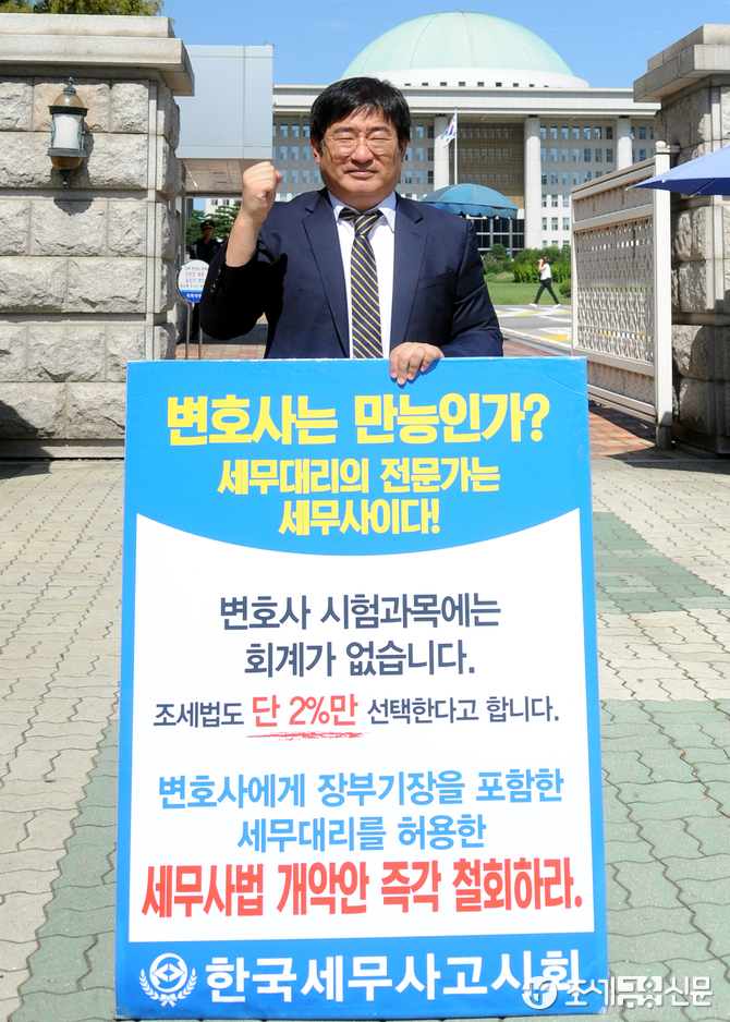 (조세금융신문=김용진 기자) 이창식 한국세무사고시회 총무 부회장이 16일 오전 국회 정문 앞에서 변호사에게 장부 기장을 포함한 세무대리를 허용한 세무사법 개악안 철회 하라는 1인 시위를 하고 있다.