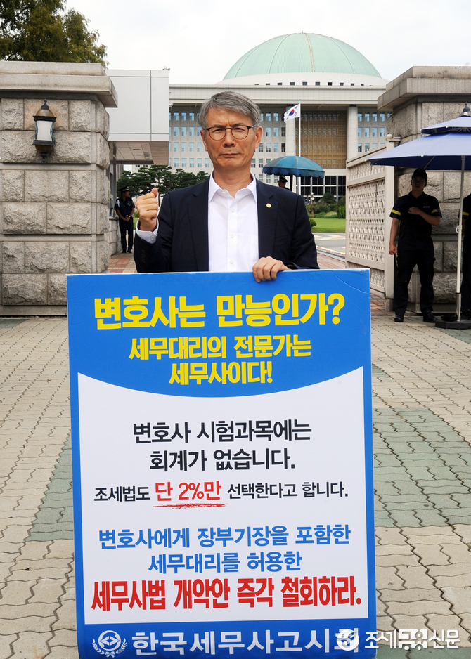 (조세금융신문=김용진 기자) 정범식 전 중부세무사회 회장이 17일 오전 국회 정문 앞에서 변호사에게 장부 기장을 포함한 세무대리를 허용한 세무사법 개악안 철회 하라는 1인 시위를 하고 있다.