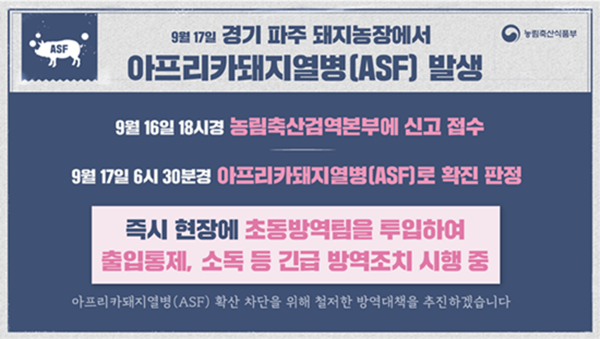 이에 방역 당국은 파주 전 지역의 돼지 농가의 이동 제한 조치 등 추가 확산을 방지하기 위해 긴급 방역을 실시하며 아프리카 돼지 열병 확산 방지에 총력을 기울이고 있다.