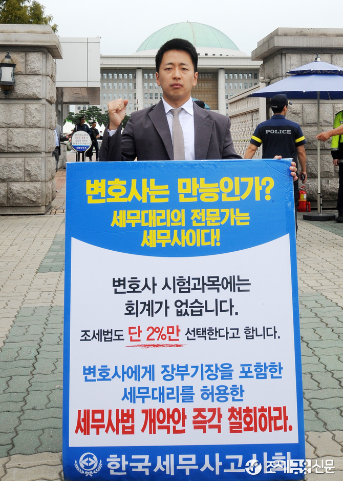 (조세금융신문=김용진 기자) 최영환 한국세무사고시회 조직부 상임이사가 20일 오전 국회 정문 앞에서 변호사에게 장부 기장을 포함한 세무대리를 허용한 세무사법 개악안 철회 하라는1인 시위를 하고 있다.