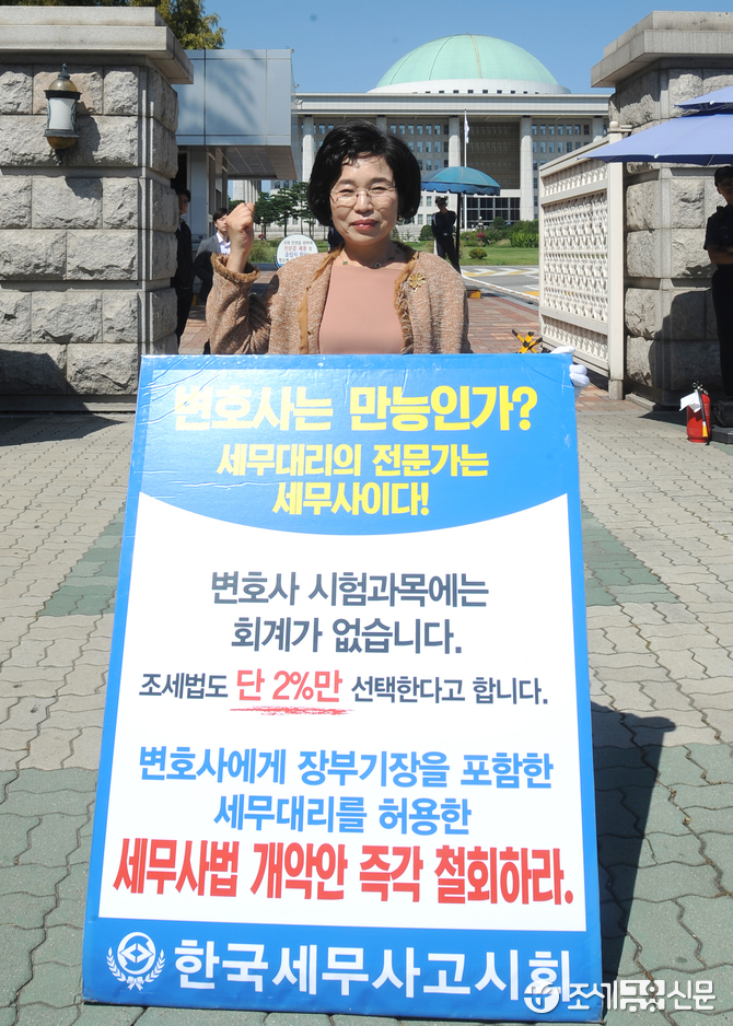 (조세금융신문=김용진 기자) 김귀순 전 한국여성세무사회 회장이 24일 오전 국회 정문 앞에서 변호사에게 장부 기장을 포함한 세무대리를 허용한 세무사법 개악안 철회 하라는1인 시위를 하고 있다.