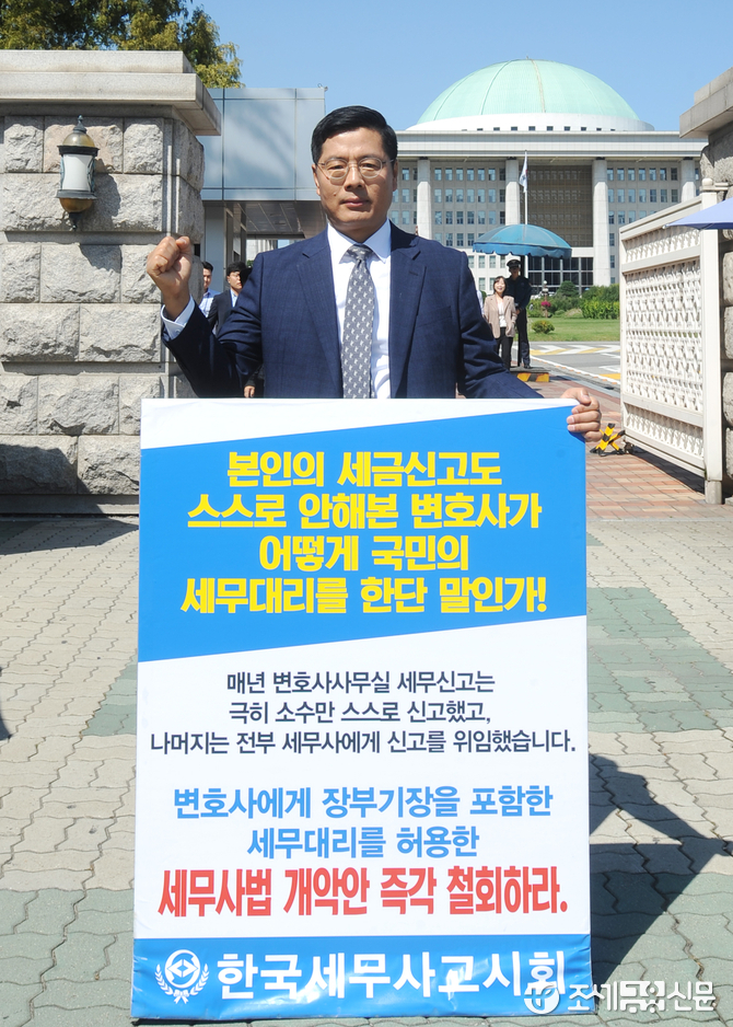 (조세금융신문=김용진 기자) 구재이 전 한국세무사고시회 회장이 24일 오전 국회 정문 앞에서 변호사에게 장부 기장을 포함한 세무대리를 허용한 세무사법 개악안 철회 하라는1인 시위를 하고 있다.