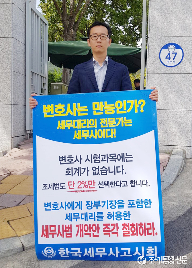 (조세금융신문=김용진 기자) 김현배 한국세무사고시회 지방,청년 상임이사가 25일 오후 과천 법무부 앞에서 변호사에게 장부 기장을 포함한 세무대리를 허용한 세무사법 개악안 철회 하라는1인 시위를 하고 있다.(사진=한국세무사고시회 제공)