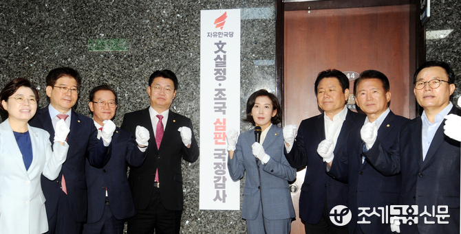 (조세금융신문=김용진 기자) 나경원 자유한국당 원내대표가 1일 오전 국회에서 열린 국정감사 종합상황실 현판식에서 의원들과 파이팅을 외치고 있다
