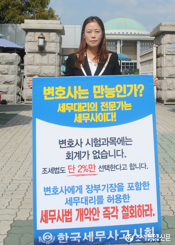 (조세금융신문=김용진 기자) 윤수정 한국세무사고시회 재무, 대외협력부회장이 4일 오전 국회 정문 앞에서 변호사에게 장부 기장을 포함한 세무대리를 허용한 세무사법 개악안 철회 하라는1인 시위를 하고 있다.
