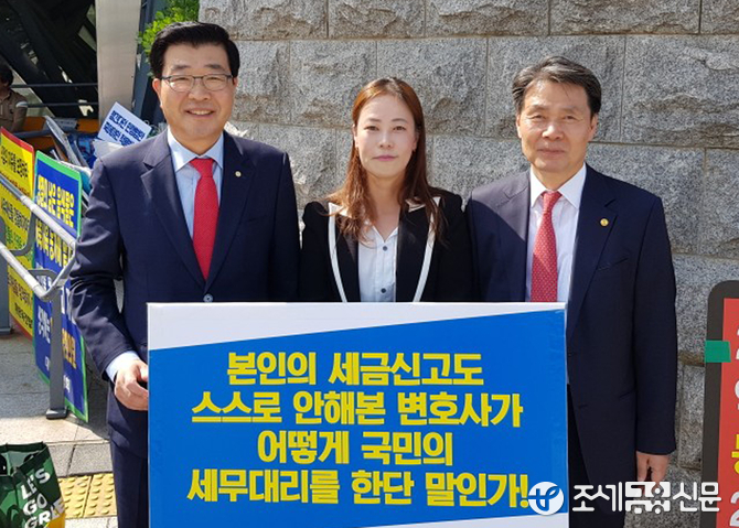 (조세금융신문=김용진 기자) 4일 국회 정문 앞에서 원경희 한국세무사회 회장(왼쪽)과 정구정 전 한국세무사회 회장(오른쪽)이 윤수정 한국세무사고시회 재무대외협력부회장(가운데)의 세무사법 개악안 철회 1인시위에 동참하고 있다.[사진=한국세무사고시회 제공]