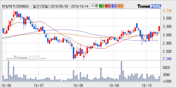 차트상 주가의 흐름은 현재 단기·중기 이평선이 정배열 상태로 전형적인 상승세를 보이고 있다. 이 종목의 차트에서 최근에 최근 60일 매물대 돌파, 일목균형표 기준선 상향교차(매수) 등을 확인할 수 있다