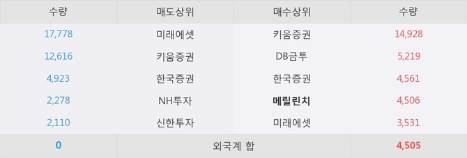 거래원 동향은 메릴린치, 미래에셋이 매수 상위 목록에 나타나고 있다.