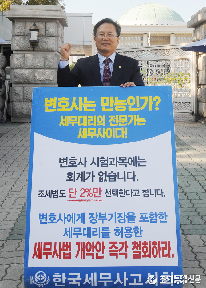 (조세금융신문=김용진 기자) 이금주 인천지방세무사회 회장이 14일 오후 국회 정문 앞에서 변호사에게 장부 기장을 포함한 세무대리를 허용한 세무사법 개악안 철회 하라는1인 시위를 하고 있다.
