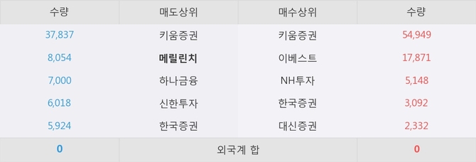 이 시각 주요 거래원은 NH투자, 키움증권, 이베스트 등이 매수 상위 창구에 자리하고 있다. 한편, 매도 창구 상위에는 메릴린치가 눈에 띄고 있다.
