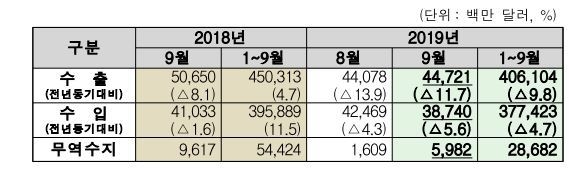 9월 수출액은 447억 달러, 수입은 387억 달러를 기록해 모두 전년 동기 대비 감소했지만, 무역수지는 59.8억 달러를 기록하며 2012년 02월 이후 92개월 연속 흑자를 이어갔다.
