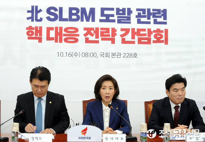 나 원내대표는 北 SLBM 도발 관련 핵 대응 전략 간담회에서 "하늘 위로는 북한 미사일이 마음대로 날아다니고 원점도 모르는 잠수함으로 한반도 위기가 레드라인을넘어 데드라인으로 가고 있다"며 "북한의 김정은과 스스로를 '남측'이라 부르는 문재인 대통령의 오만이 빚은 안보파산"이라고 비판했다.