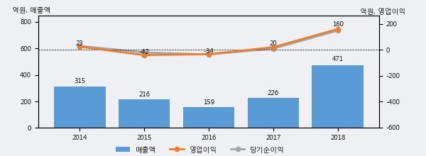 최근 실적을 살펴보면 2018년 매출액이 최근 5년 중 가장 높은 실적을 기록했음을 알 수 있다. 이전 최고 실적이었던 2014년 보다도 49.5%(156억원) 늘어난 것으로 나타났다.