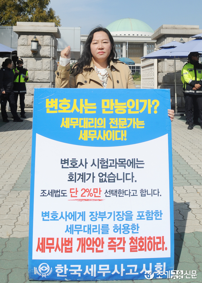 (조세금융신문=김용진 기자) 이은선 인천지방세무사회 조세제도연구 위원이 16일 오전 국회 정문 앞에서 변호사에게 장부 기장을 포함한 세무대리를 허용한 세무사법 개악안 철회 하라는1인 시위를 하고 있다.