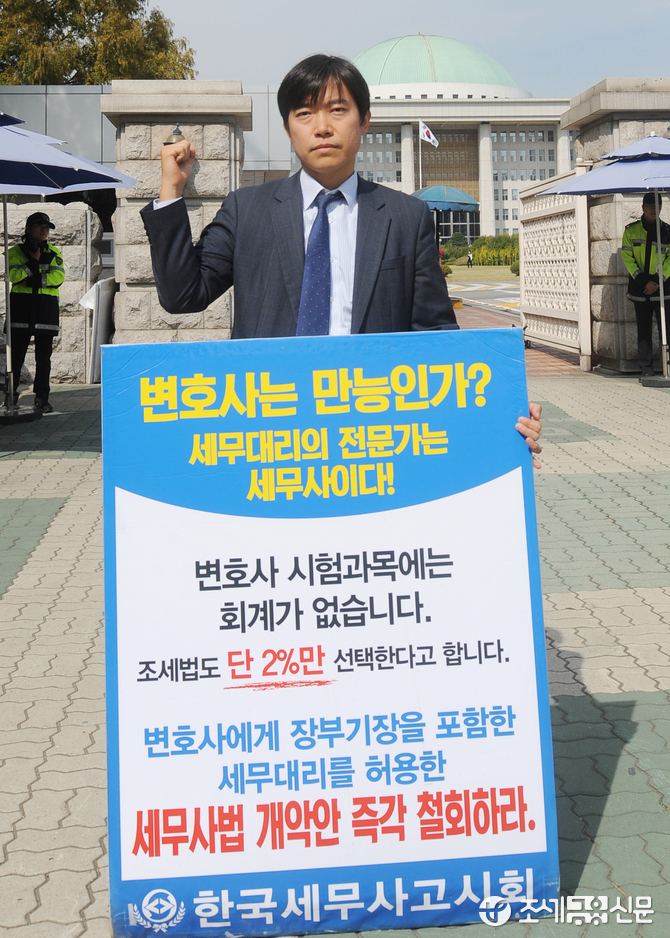 (조세금융신문=김용진 기자) 신영규 강서지역세무사회 총무가 16일 오전 국회 정문 앞에서 변호사에게 장부 기장을 포함한 세무대리를 허용한 세무사법 개악안 철회 하라는1인 시위를 하고 있다.