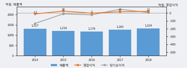 최근 실적을 살펴보면 2018년 매출액이 최근 5년 중 가장 높은 실적을 기록했음을 알 수 있다. 이전 최고 실적이었던 2014년 보다도 0.5%(6억 9천만원) 늘어난 것으로 나타났다.