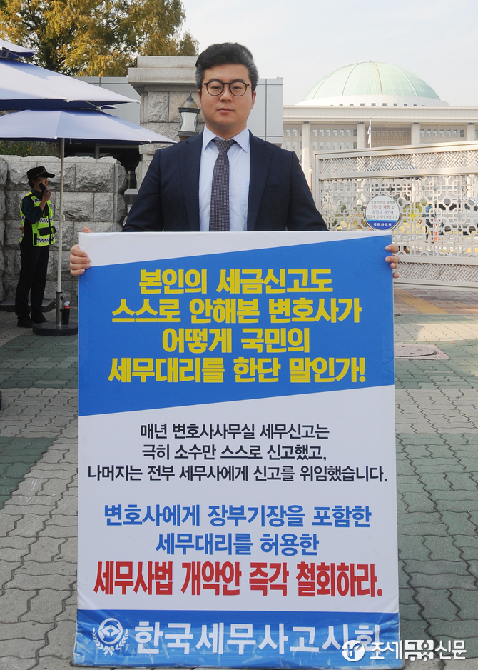 (조세금융신문=김용진 기자) 조현우 세무사(한국세무사고시회 회원)가 21일 오후 국회 정문 앞에서 변호사에게 장부 기장을 포함한 세무대리를 허용한 세무사법 개악안 철회를 주장하며 1인 시위를 하고 있다.
