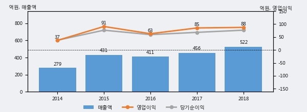 최근 실적을 살펴보면 2018년 매출액이 최근 5년 중 가장 높은 실적을 기록했음을 알 수 있다. 이전 최고 실적이었던 2017년 보다도 14.7%(66억 8천만원) 늘어난 것으로 나타났다.