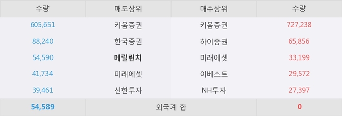 거래원 동향은 미래에셋, NH투자 등이 매수 상위 목록에 나타나고 있다. 한편, 매도 창구 상위에는 메릴린치가 눈에 띄고 있다.