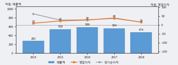 빛샘전자의 2018년 매출액은 474억으로 전년대비 -16.0% 하락했고, 영업이익 역시 16억으로 전년대비 -59.6% 하락했다. 이 회사의 매출액 증감률과 영업이익 증감률은 각각 코스닥 하위 16%, 하위 27%에 해당된다.