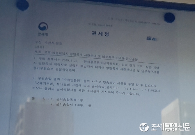 (조세금융신문=김소현 기자) 서울 강남구에 위치한 서울본부세관 정문 알림판에는 고액·상습 체납자수십 명의 이름과 주소, 나이가 공개돼 있다.