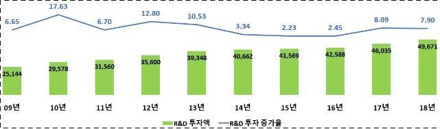 R&D 투자액 1조원 이상인 기업은 삼성전자, SK하이닉스, LG전자, 현대자동차, 삼성디스플레이, 기아자동차, LG디스플레이, LG화학 등 8개로 집계됐다.