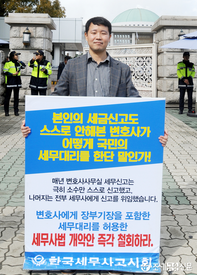 (조세금융신문=김용진 기자) 백승호 세무사가 29일 오전 국회 정문 앞에서 변호사에게 장부 기장을 포함한 세무대리를 허용한 세무사법 개악안 철회를 주장하며 1인시위를 하고 있다.