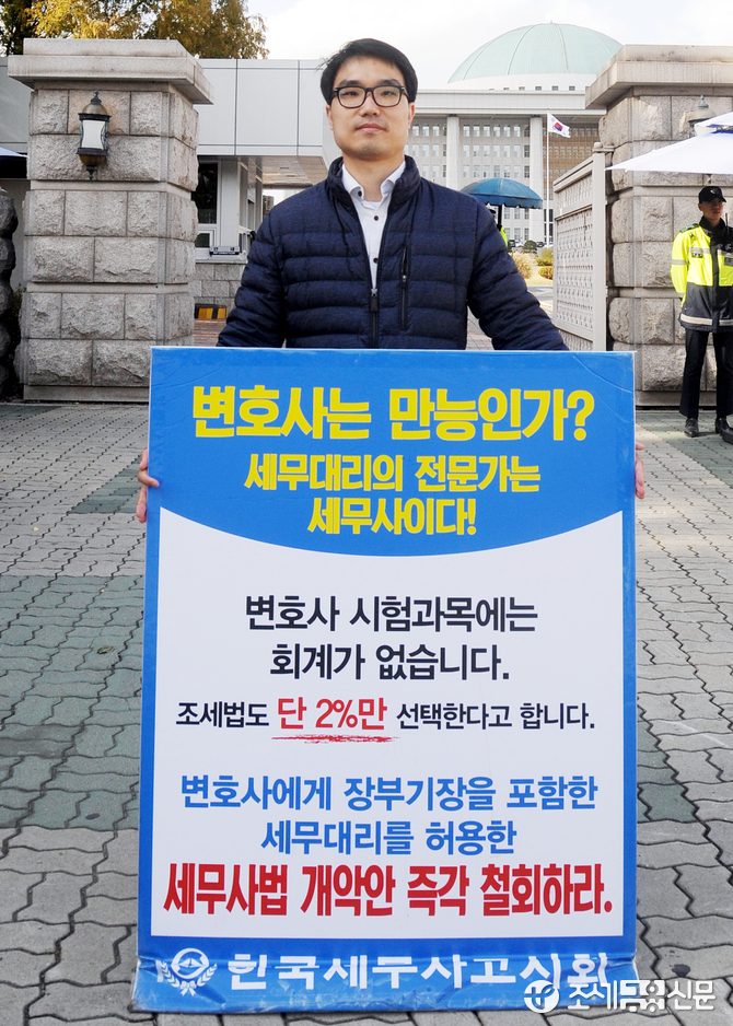 (조세금융신문=김용진 기자) 김성호 (한국세무사회 회원)세무사가 29일 오후 국회 정문 앞에서 변호사에게 장부 기장을 포함한 세무대리를 허용한 세무사법 개악안 철회를 주장하며 1인시위를 하고 있다.