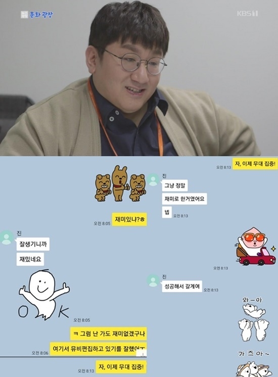 메시지에는 방시혁이 "재미있냐"고 묻자 진은 "잘생기니까 재밌네요"라고 답했다. 그러자 방시혁은 "그럼 난 가도 재미없겠구나. 여기서 뮤비 편집하고 있기를 잘했어"라며 "자, 이제 무대 집중"이라고 말했다.