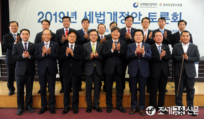 (조세금융신문=김용진 기자) 이종후 국회 예산 정책처장이 원경희 한국세무사회 회장과 정구정 전 한국세무사회 회장이 30일 오후 국회 의원회관 제1소회의실에서 열린 2019년 세법 개정안 토론회에서 참석자들이 기념 촬영을 하고 있다.