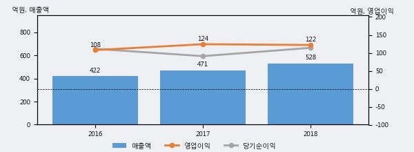 최근 실적을 살펴보면 2018년 매출액이 최근 3년 중 가장 높은 실적을 기록했음을 알 수 있다. 이전 최고 실적이었던 2017년 보다도 12.1%(57억원) 늘어난 것으로 나타났다.