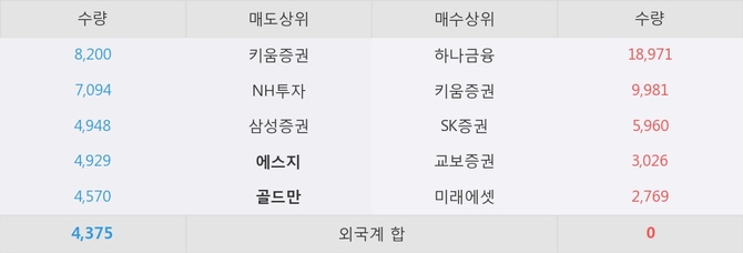 거래원 동향은 하나금융, 미래에셋 등이 매수 상위 목록에 나타나고 있다. 한편, 매도 창구 상위에는 에스지와 골드만이 눈에 띄고 있다.