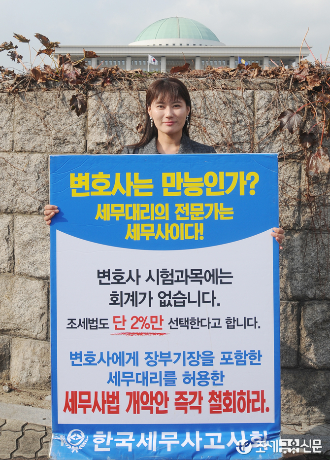 (조세금융신문=김용진 기자) 박유리 한국세무사고시회 총무 이사가 31일 오후 국회 정문 앞에서 변호사에게 장부 기장을 포함한 세무대리를 허용한 세무사법 개악안 철회를 촉구하는 1인 시위를 하고 있다.