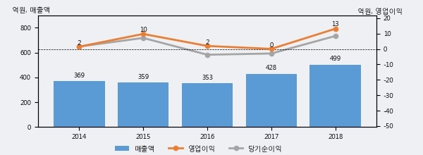 최근 실적을 살펴보면 2018년 매출액이 최근 5년 중 가장 높은 실적을 기록했음을 알 수 있다. 이전 최고 실적이었던 2017년 보다도 16.6%(70억 9천만원) 늘어난 것으로 나타났다.