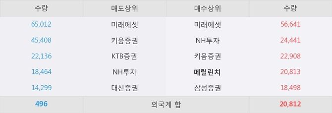 거래원 동향은 메릴린치, 미래에셋, NH투자 등이 매수 상위 목록에 나타나고 있다.