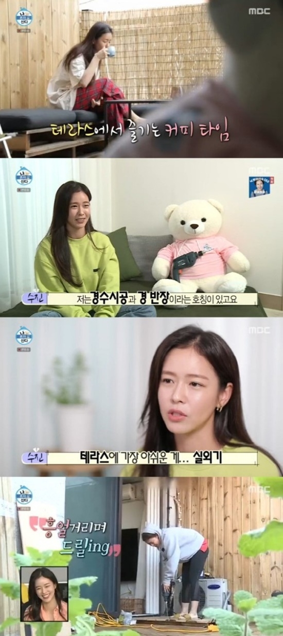 그녀는 현재 거주하고 있는 집 테라스에 가림막, 인조잔디 등을 직접 설치한 것이라 밝히며 폭우로 접어뒀던 인조잔디를 손쉽게 펼쳤다.