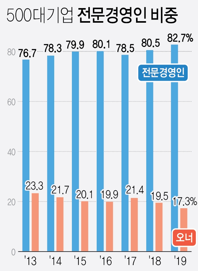 조사 기간인 2012년부터 올해까지 전문경영인 비중은 지속해서 상승하는 추세를 보였다.