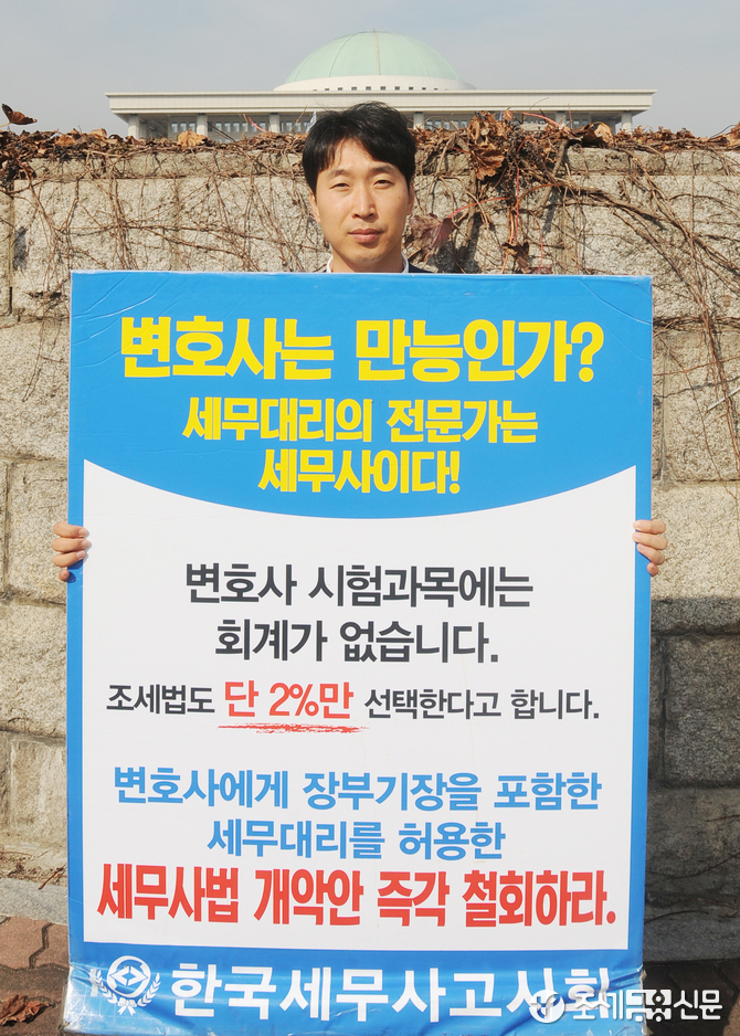 (조세금융신문=김용진 기자) 강현삼 한국세무사고시회 연수 상임이사가 6일 오전 국회 정문 앞에서 변호사에게 장부 기장을 포함한 세무대리를 허용한 세무사법 개악안 철회를 촉구하는 1인 시위를 하고 있다.