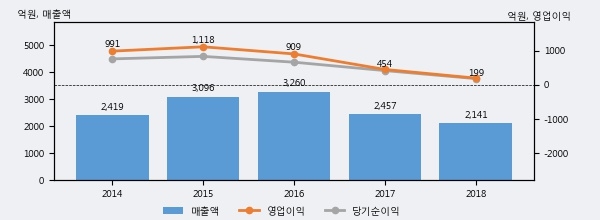 잇츠한불의 2018년 매출액은 전년대비 -12.9% 줄어든 2141억원이고, 영업이익 역시 전년대비 -56.1% 줄어든 199억원을 기록했다. 이 회사의 매출액 증감률과 영업이익 증감률은 각각 코스피 하위 10%, 하위 19%에 해당된다.