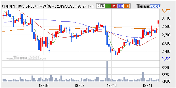 티케이케미칼의 2018년 매출액은 전년대비 10.4% 늘어난 7890억원이고, 영업이익 또한 전년대비 475.3% 늘어난 545억원을 기록했다. 이 회사의 매출액 증감률과 영업이익 증감률은 각각 코스닥 상위 37%, 상위 3%에 해당된다.