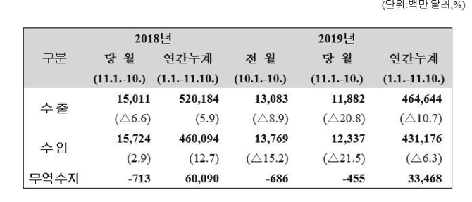 한편, 이번 달 10일까지의 무역 수지는 4억 5500만 달러 적자를 기록하며 올해 10월 동기의 무역수지(- 6억 8600만 달러) 적자 추세를 이어가고 있다.