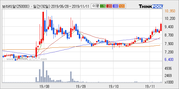 차트상 주가의 흐름은 현재 단기·중기 이평선이 정배열 상태로 전형적인 상승세를 보이고 있다. 이 종목의 차트에서 최근에 캔들패턴(상승반전형), 최근 60일 매물대 돌파 등을 확인할 수 있다