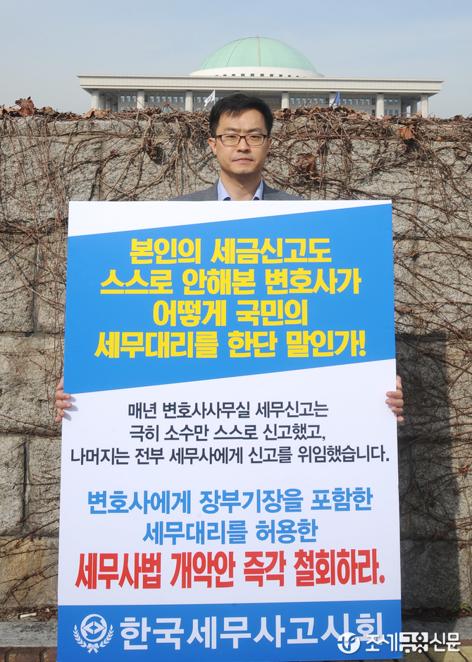 (조세금융신문=김용진 기자) 김범석 한국세무사고시회 조직 부회장이 12일 오전 국회 정문 앞에서 변호사에게 장부 기장을 포함한 세무대리를 허용한 세무사법 개악안 철회를 촉구하는 1인 시위를 하고 있다.