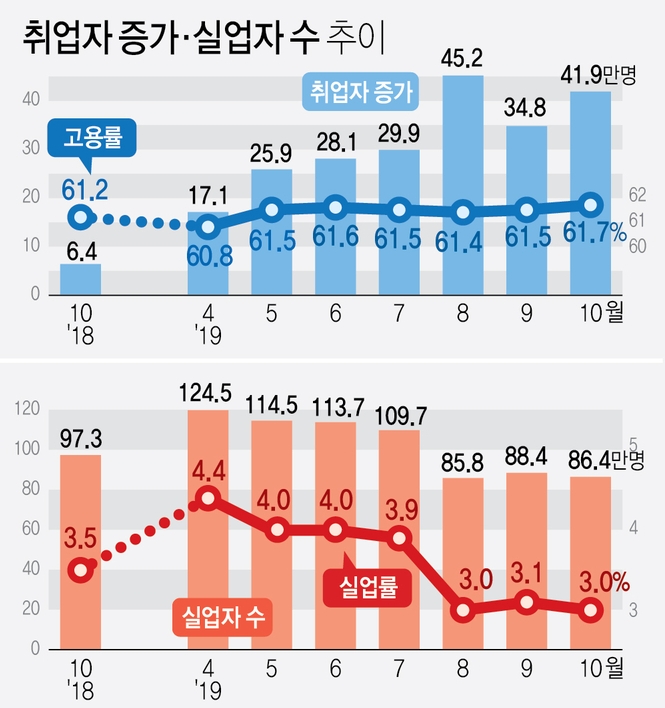 10월 기준으로 고용률은 23년 만에 가장 높았고, 실업률은 6년 만에 가장 낮았다.