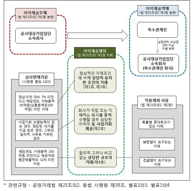새 지침은 '특수관계인(총수 동일인 및 친족)이 일정 지분 이상을 보유한 회사와 상당히 유리한 조건의 거래, 사업 기회 제공, 합리적 고려·비교 없는 상당 규모 거래 등을 통해 특수관계인에 부당 이익을 귀속하는 것을 금지한다'는 공정거래법(제23조 2) 규정을 강화했다.