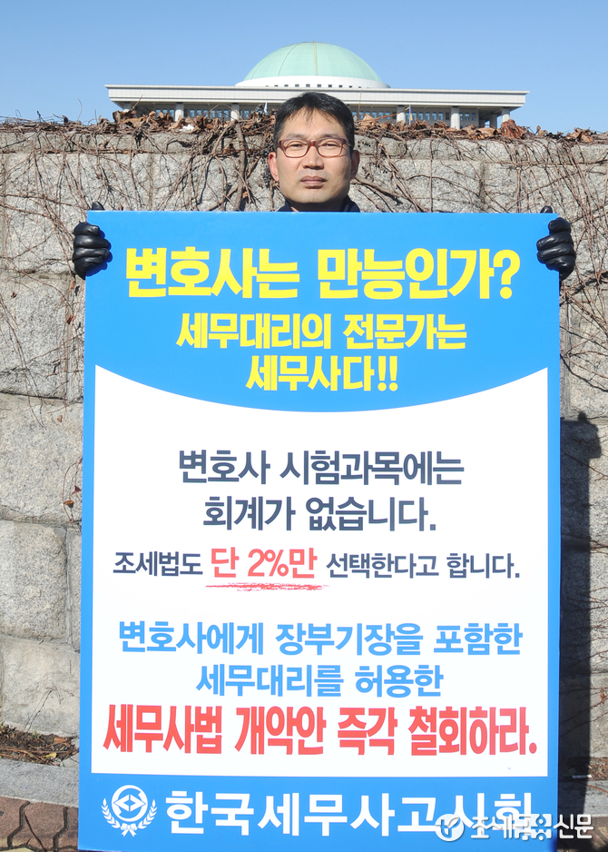 (조세금융신문=김용진 기자) 박종철 한국세무사고시회 센터장이 14일 오전 국회 정문 앞에서 변호사에게 장부 기장을 포함한 세무대리를 허용한 세무사법 개악안 철회를 촉구하는 1인시위를 하고 있다.