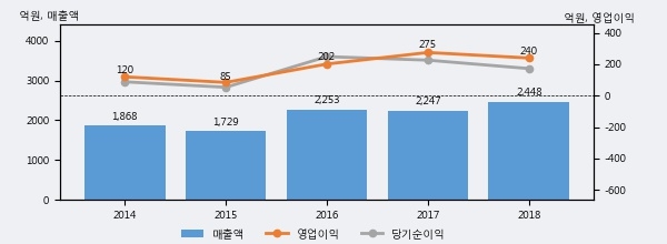 최근 실적을 살펴보면 2018년 매출액이 최근 5년 중 가장 높은 실적을 기록했음을 알 수 있다. 이전 최고 실적이었던 2016년 보다도 8.6%(194억 6천만원) 늘어난 것으로 나타났다.