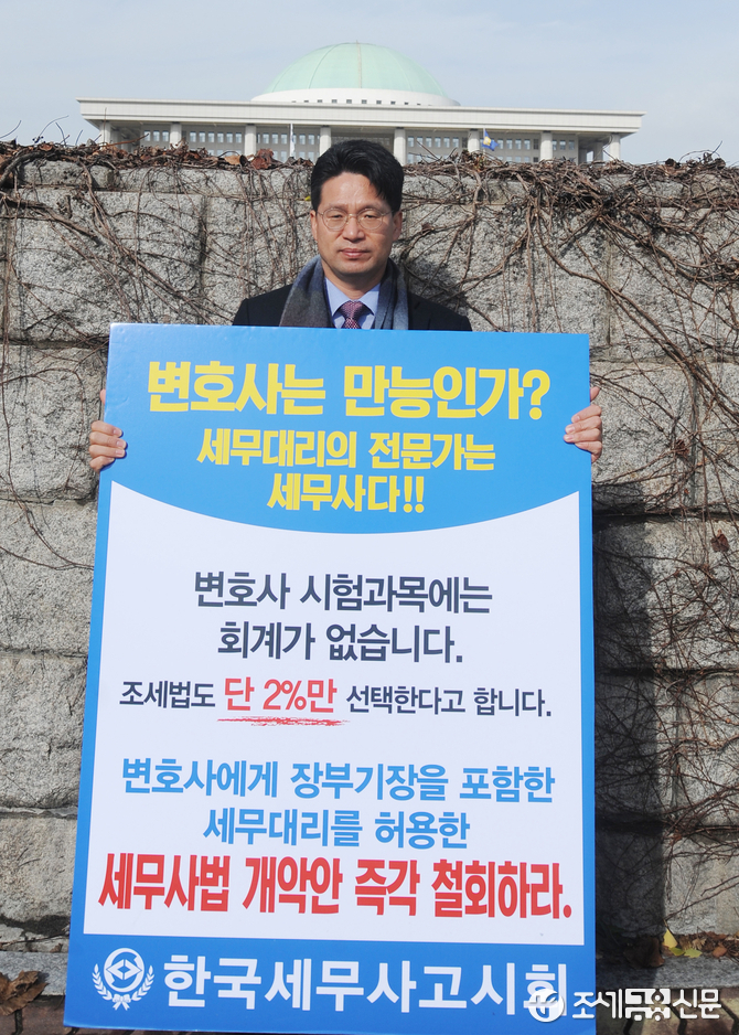 (조세금융신문=김용진 기자) 이석정 한국세무사고시회 기획부회장이 18일 오전 국회 정문 앞에서 변호사에게 장부 기장을 포함한 세무대리를 허용한 세무사법 개악안 철회를 촉구하는 1인시위를 하고 있다.