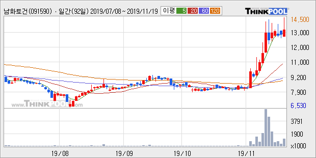 일봉 차트의 모습은 현재 단기·중기 이평선이 정배열 상태로 전형적인 상승세를 보이고 있다. 최근 이 종목의 차트에서 최근 60일 매물대 돌파, 최근 5일 매물대 돌파 등의 특이사항이 발생했다.